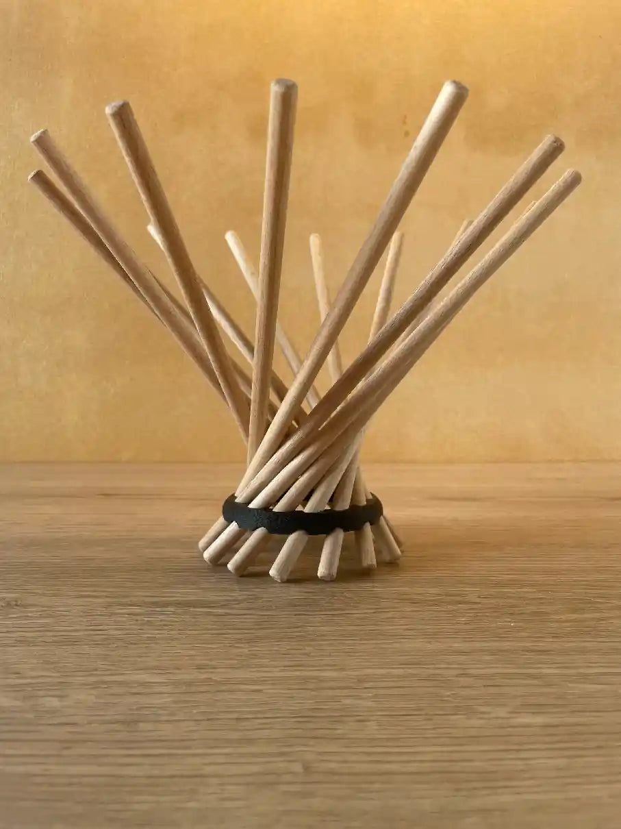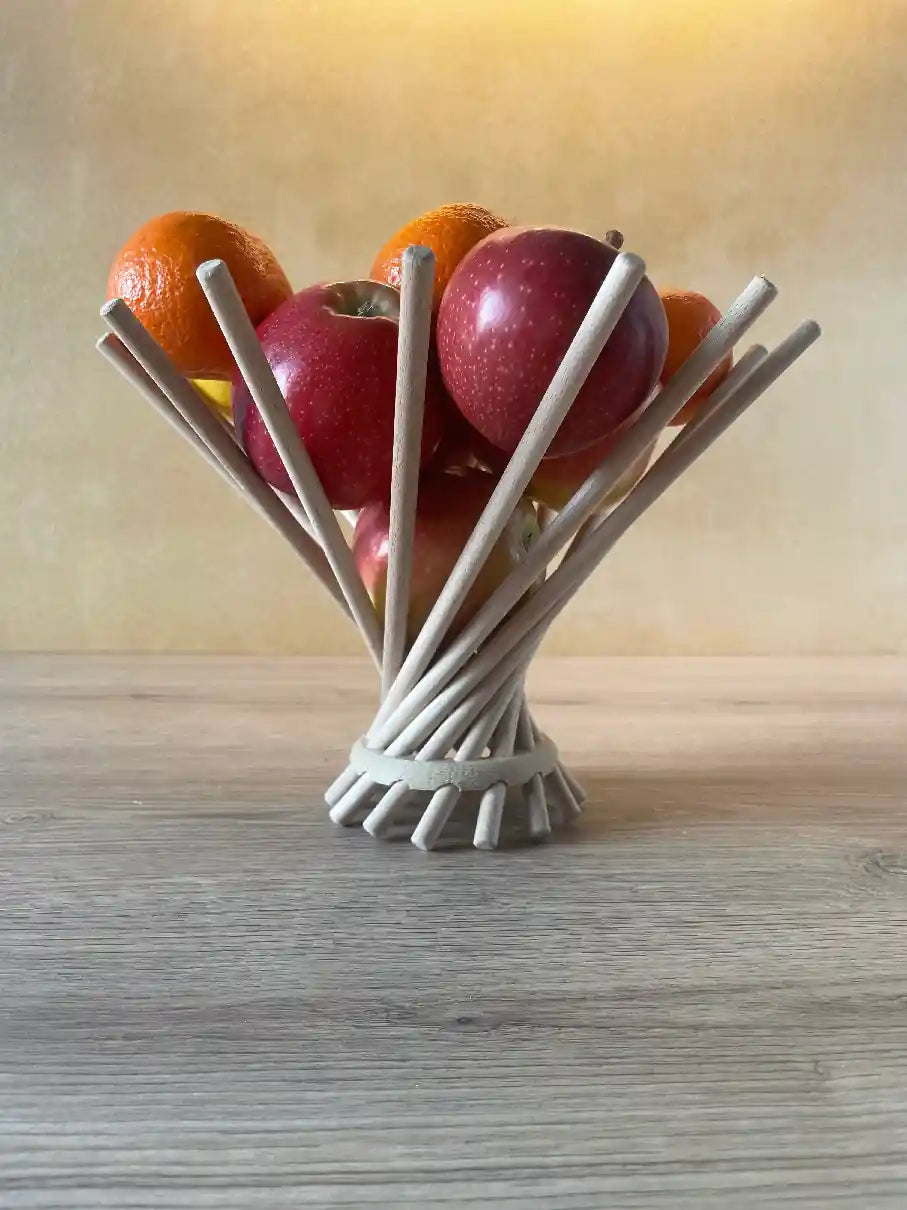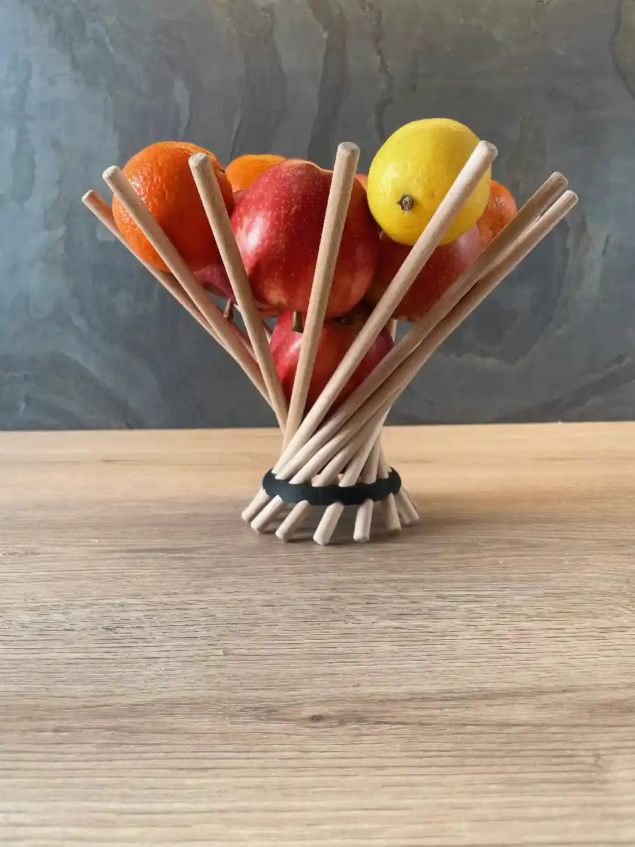 Die steckbare Schale besteht aus dem Torion (Kunststoff) und 14 unbehandelten Holzstäben, die in das Torion gesteckt werden. Dem Aufsteller der steckbare Schale ist es überlassen, wie weit die Stäbe durch das Torion Variante Ring gesteckt werden, dadurch ergeben sich unterschiedlich große Volumen für die Ablage von Obst oder Gemüse. Es sollten jedoch mindestens 3cm sein um die Stabilität der steckbare Schale zu gewährleisten.